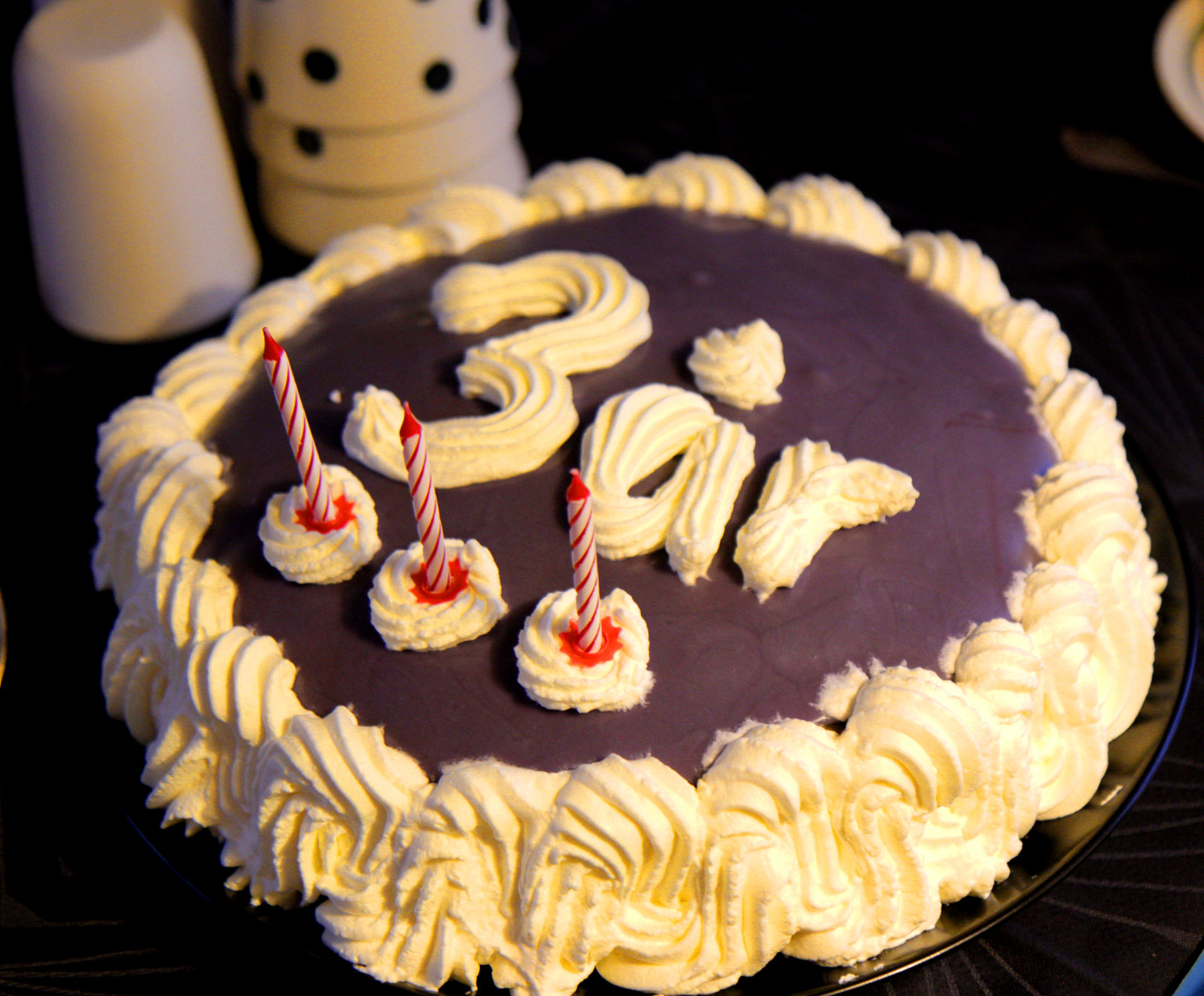 Pisk flødeskum og hæld i sprøjtepose med stor tyl og pynt lagkagen. Servér.
