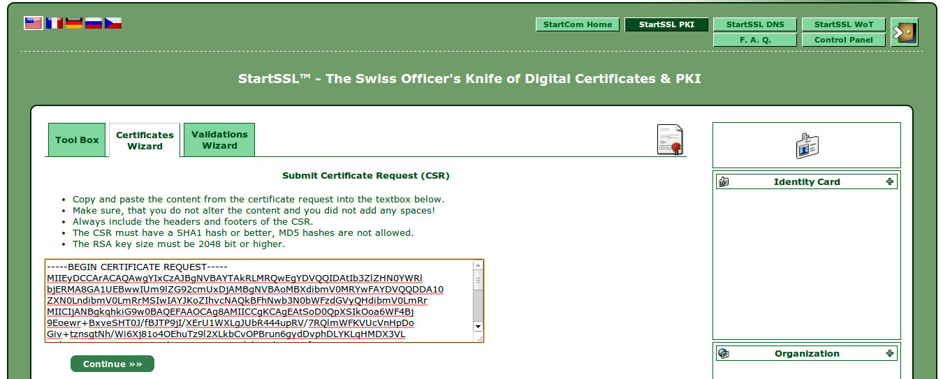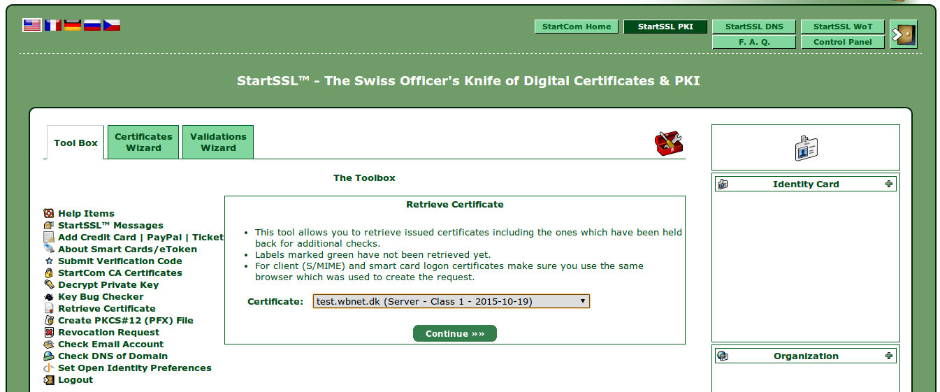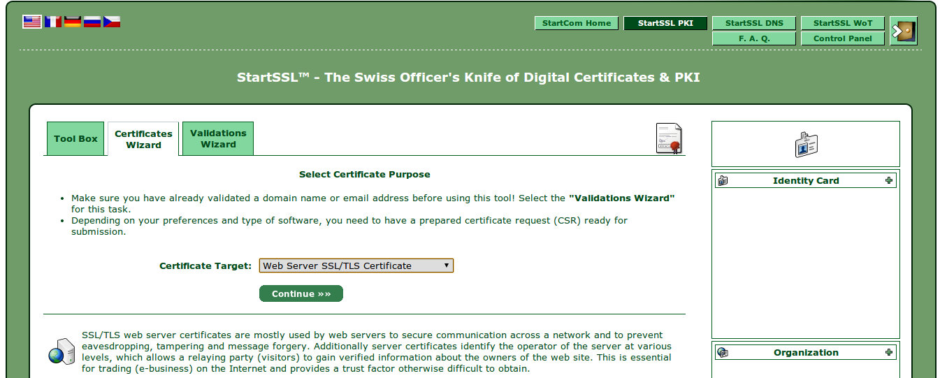 Then go to the StartSSL control panel. Select Certificates Wizard and select Web Server SSL/TLS Certificate in the drop down and click Continue.