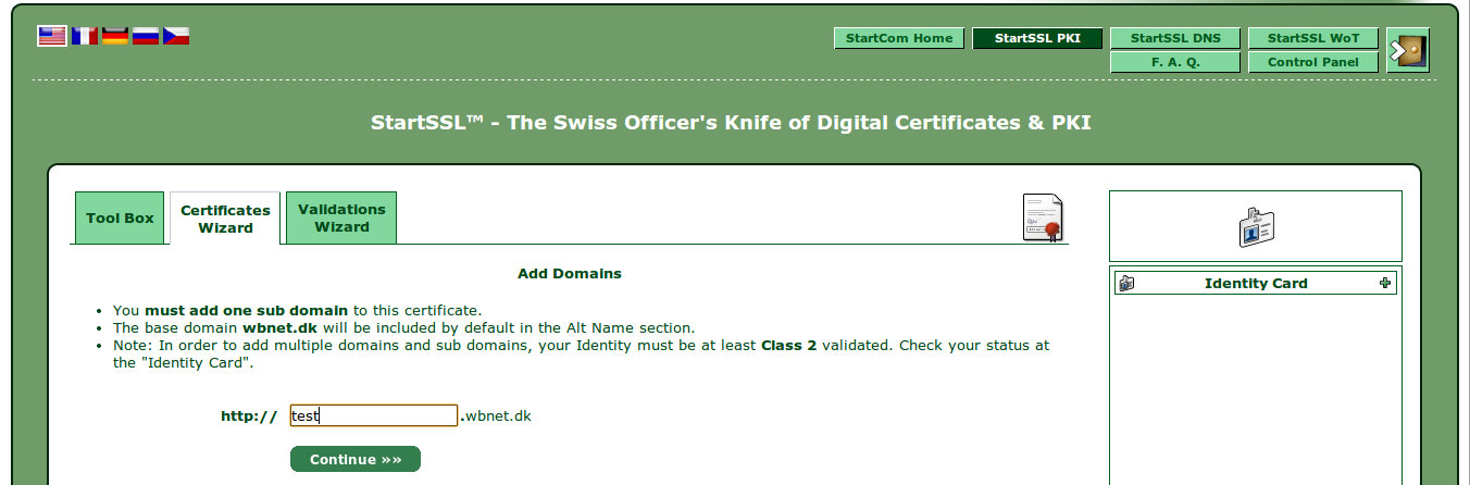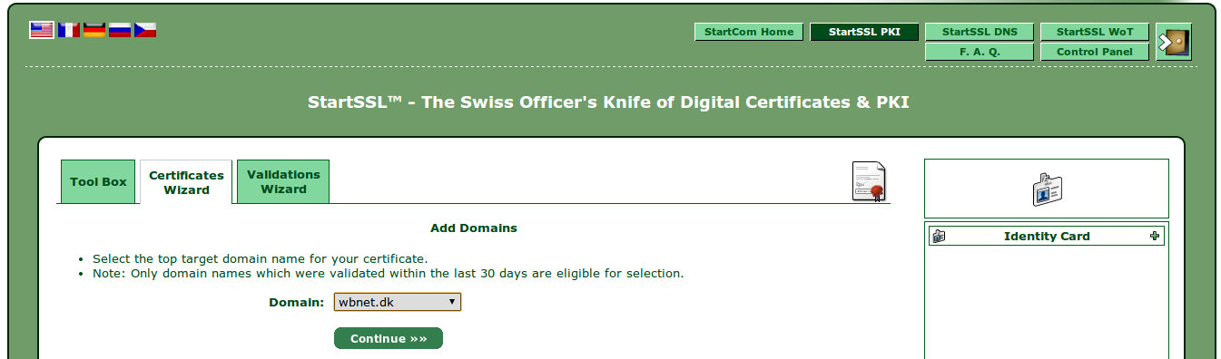 Before you can issue valid SSL/TLS certificates you must own a domain (e.g. wbnet.dk) and validate that you are the owner of the domain, by being able to receive mails from StartSSL to the postmaster address of the domain. Also, you must validate any mail-addresses (e.g. test@wbnet.dk) you plan to use as the contact person in the certificate(s).