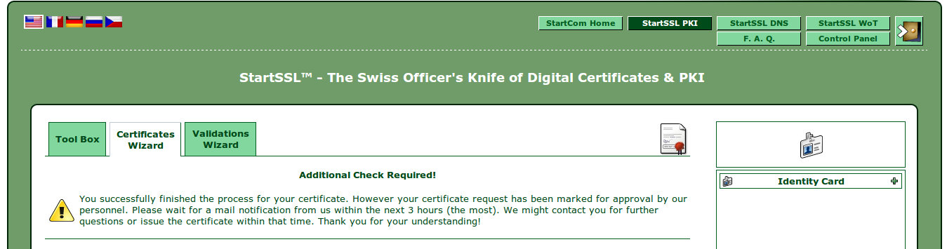 For some hostnames (including test), a manual verification must be made by StartSSL and you will be shown the message below. Otherwise, you will be taken directly to the certificate.