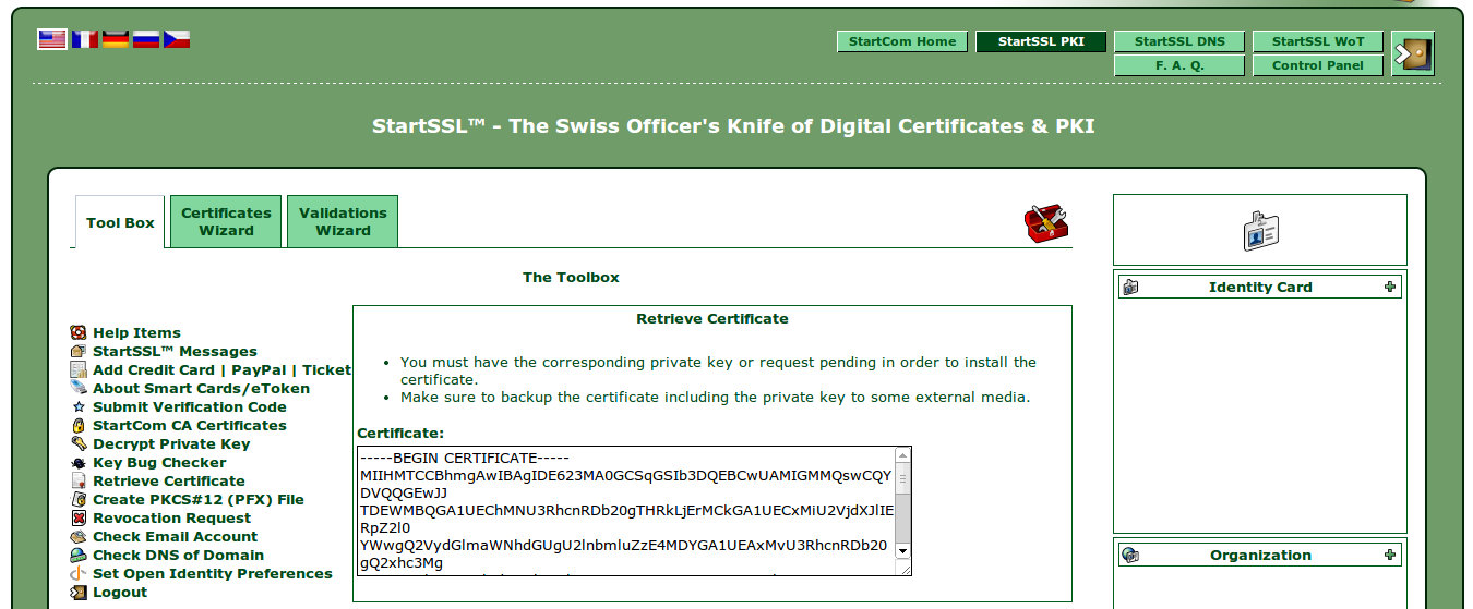 After a short period of time (max 3 hours) go to Control Panel and click Retrieve Certificate. Select the proper certificate in the drop down menu: